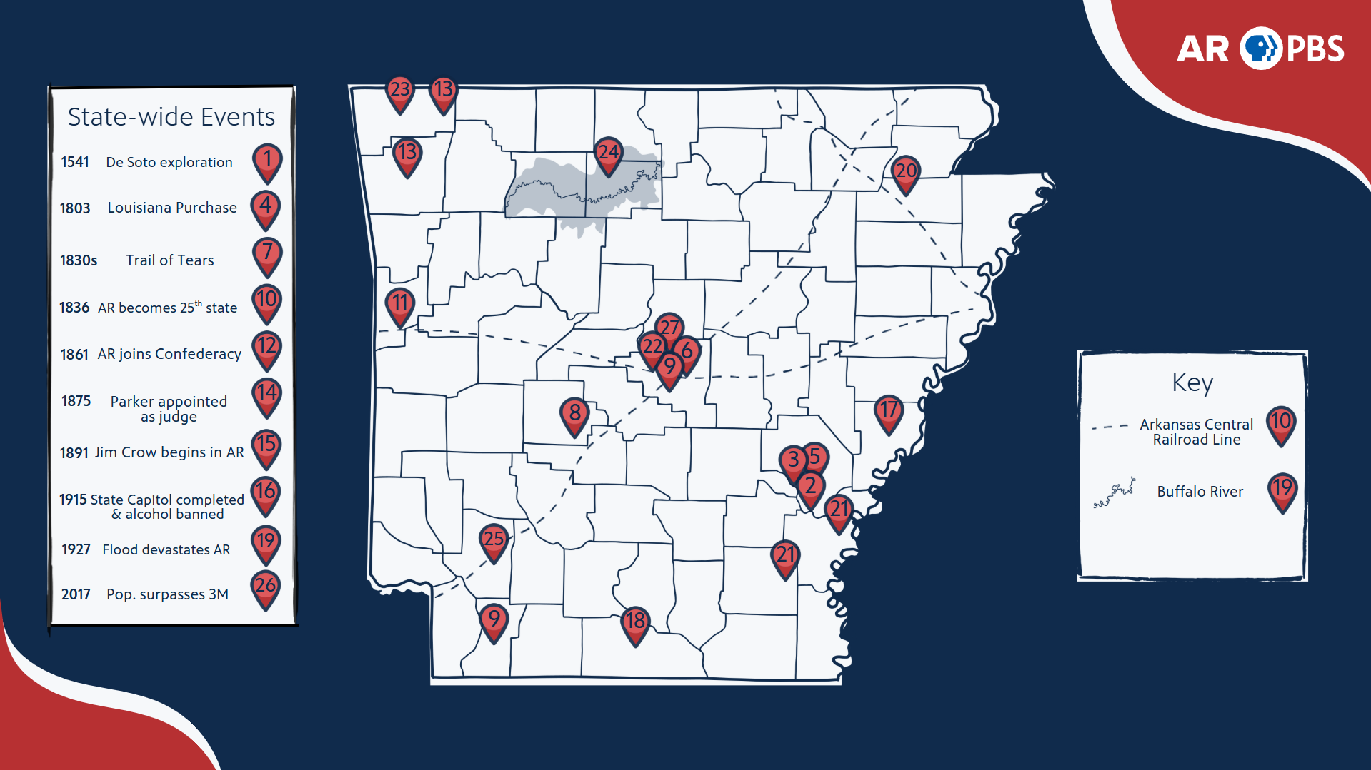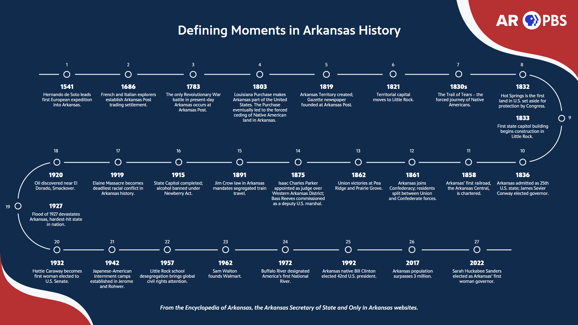 Learn about Arkansas’s rich history and explore the moments that shaped who we are today. Our interactive timeline invites you to reflect on our shared story—both as a nation and here in Arkansas—as we journey toward the 250th anniversary of the Declaration of Independence in July 2026.