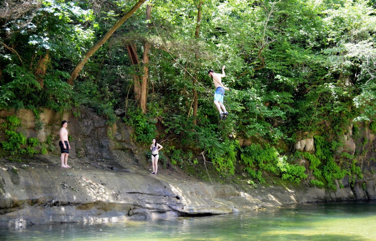 Blanchard Springs Recreation Area swimming hole - young man and young woman in swimsuits stand along a short bluff line shortly below a wooded area at the edge of a swimming hole while another young man in blue swimming trunks and water shoes is suspended mid-air as he drops from a rope swing into the water.
