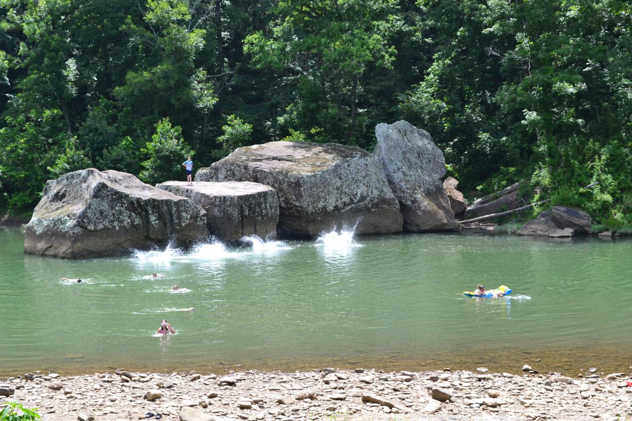 There’s, of course, a rope swing, but the bluffline is what’s most impressive— it extends for almost a quarter of a mile downstream, which means there’s plenty of space for everyone. After a cool, refreshing dip you can cook out on one of the many grills. There are also three hiking trails, a large pavilion with lights, and a playground with swings.