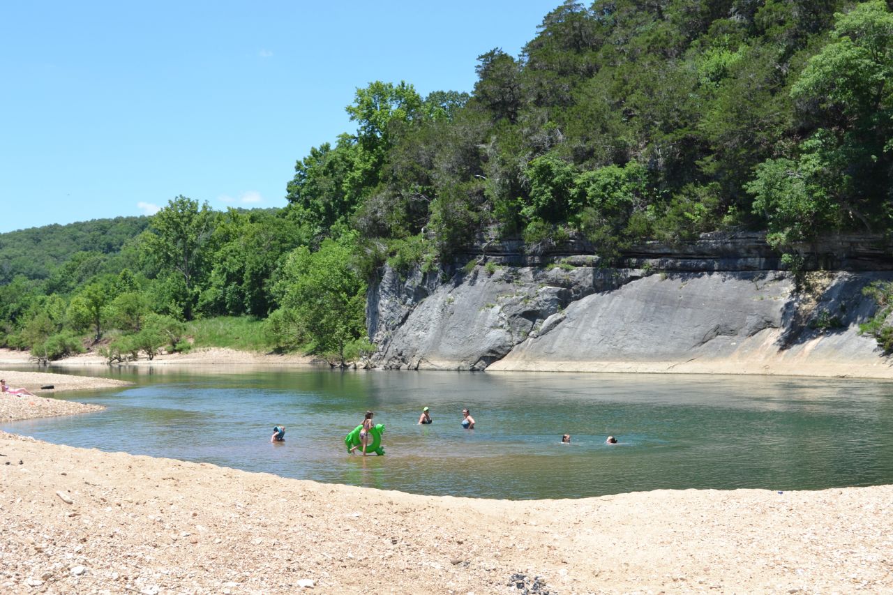 Ozark Campground Swimming Area - families play in shallow water and along the shoreline of a river in front of a forested bluff.