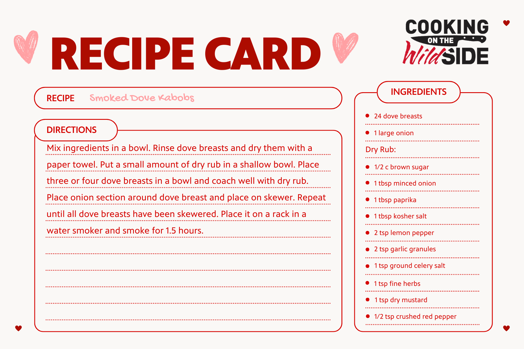 Mix dry rub ingredients in a bowl. Rinse dove breasts, and dry them with a paper towel. Put a small amount of dry rub in a shallow bowl. Place three or four dove breasts in a bowl, and coat well with dry rub. Place onion section around dove breast, and place on skewer. Repeat until all dove breasts have been skewered. Place kabobs on a rack in a water smoker, and smoke for 1.5 hours.