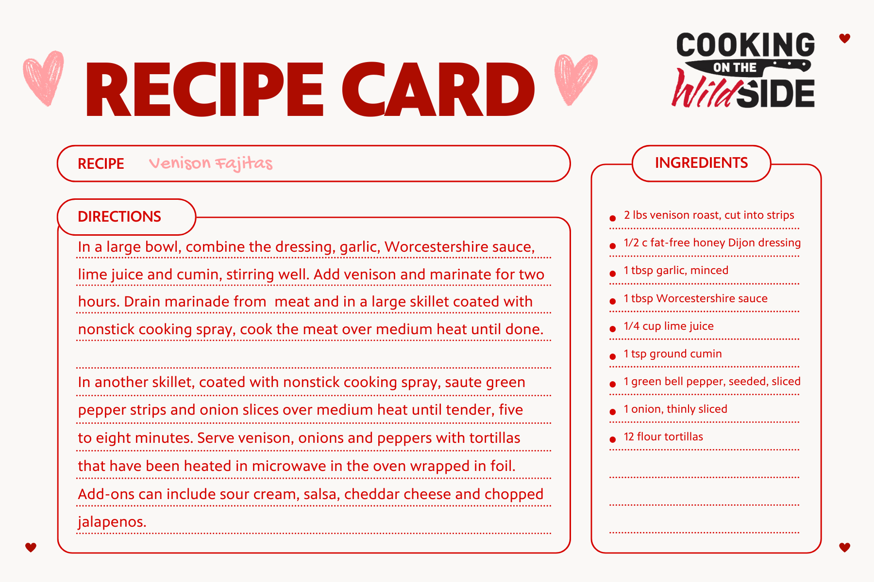 You may talk a mighty fine game to your significant other, but you can also make some mighty fine game for your significant other this Valentine’s Day. Get the main course going with these venison fajitas, packed with flavors from Worcestershire sauce, garlic and cumin to the crunchybell peppers and onions.