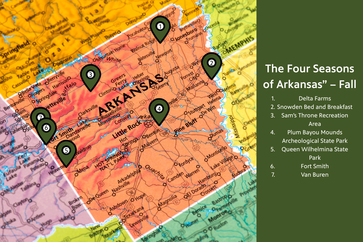 Visit Delta Farm Tours, the Snowden Bed and Breakfast, Sam’s Throne, Ponca, Toltec Mounds Archeological State Park, Queen Wilhelmina State Park, Talimena Scenic Drive, Fort Smith and Van Buren.