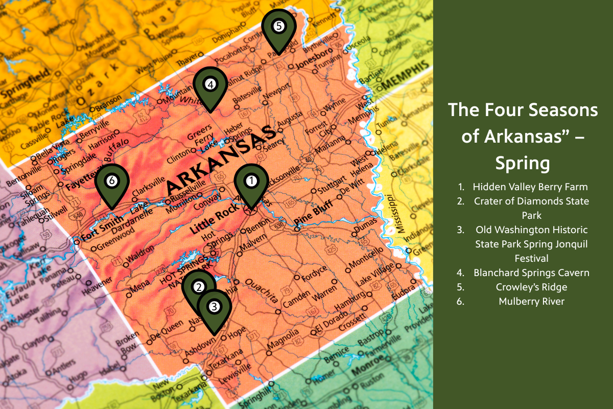 Visit Hidden Valley Berry Farm, Crater of Diamonds State Park, Old Washington Historic State Park’s Spring Jonquil Festival, a bladesmithing school featuring the Bowie Knife, Blanchard Springs Cavern, four state parks atop Crowley’s Ridge and the Mulberry River.