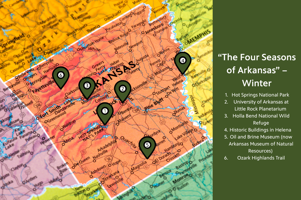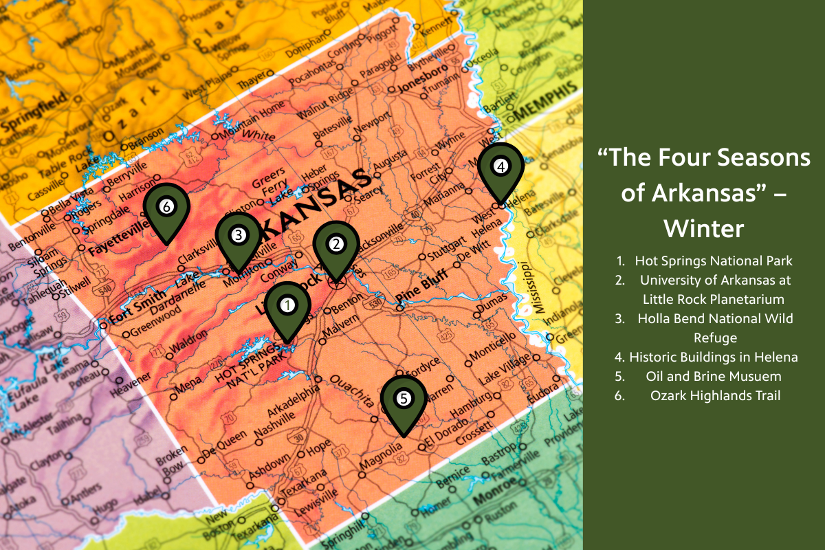 Visit Hot Springs National Park, the University of Arkansas at Little Rock’s Planetarium, the Holla Bend National Wildlife Refuge southeast of Russellville, historic buildings in Helena, the Oil and Brine Museum and the Ozark Highlands Trail.