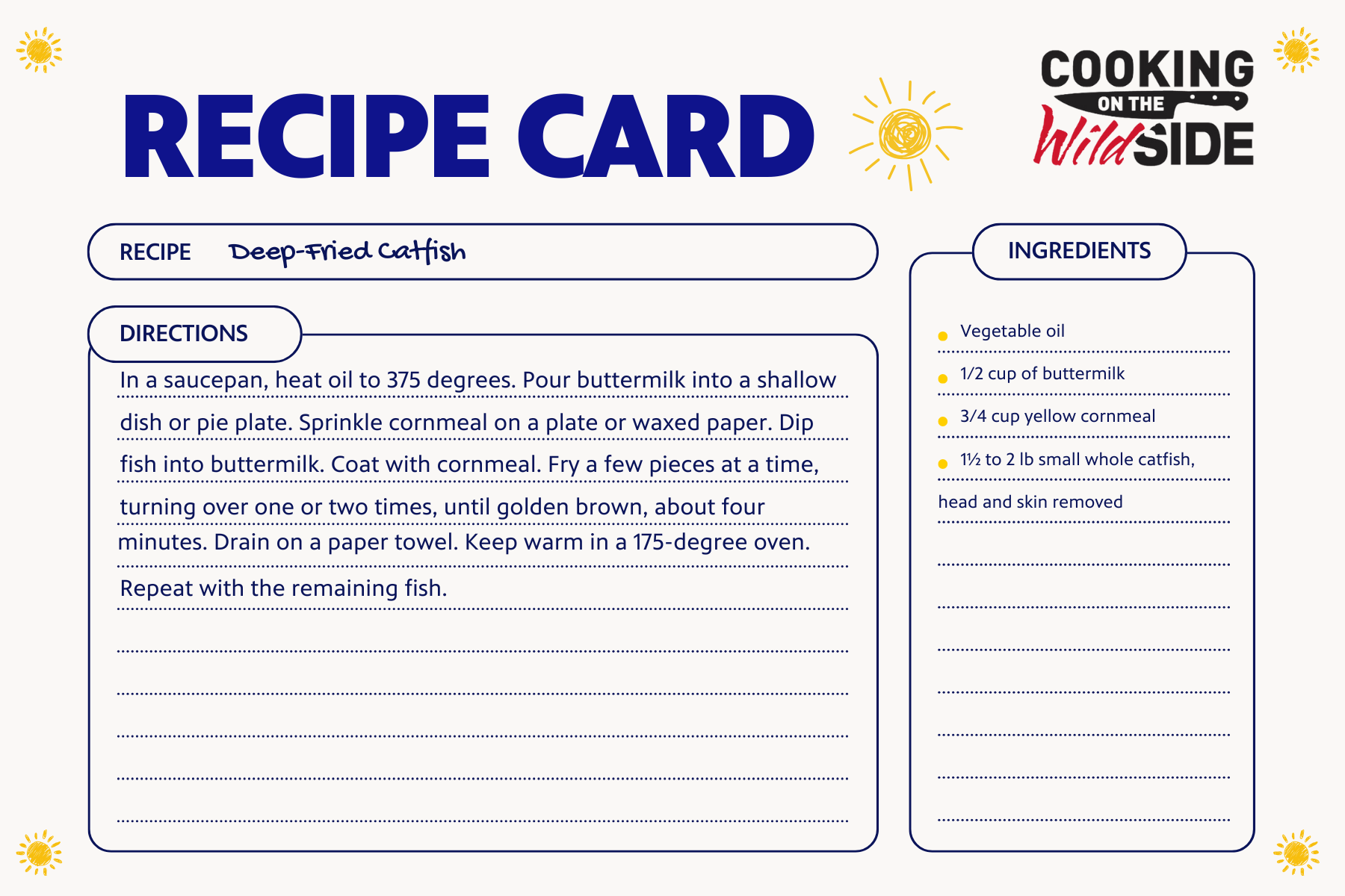 What’s better than taking your catch and frying it for the family? This easy recipe will make you want to head back to your favorite fishing spot. Read on for a great side to pair with this recipe.