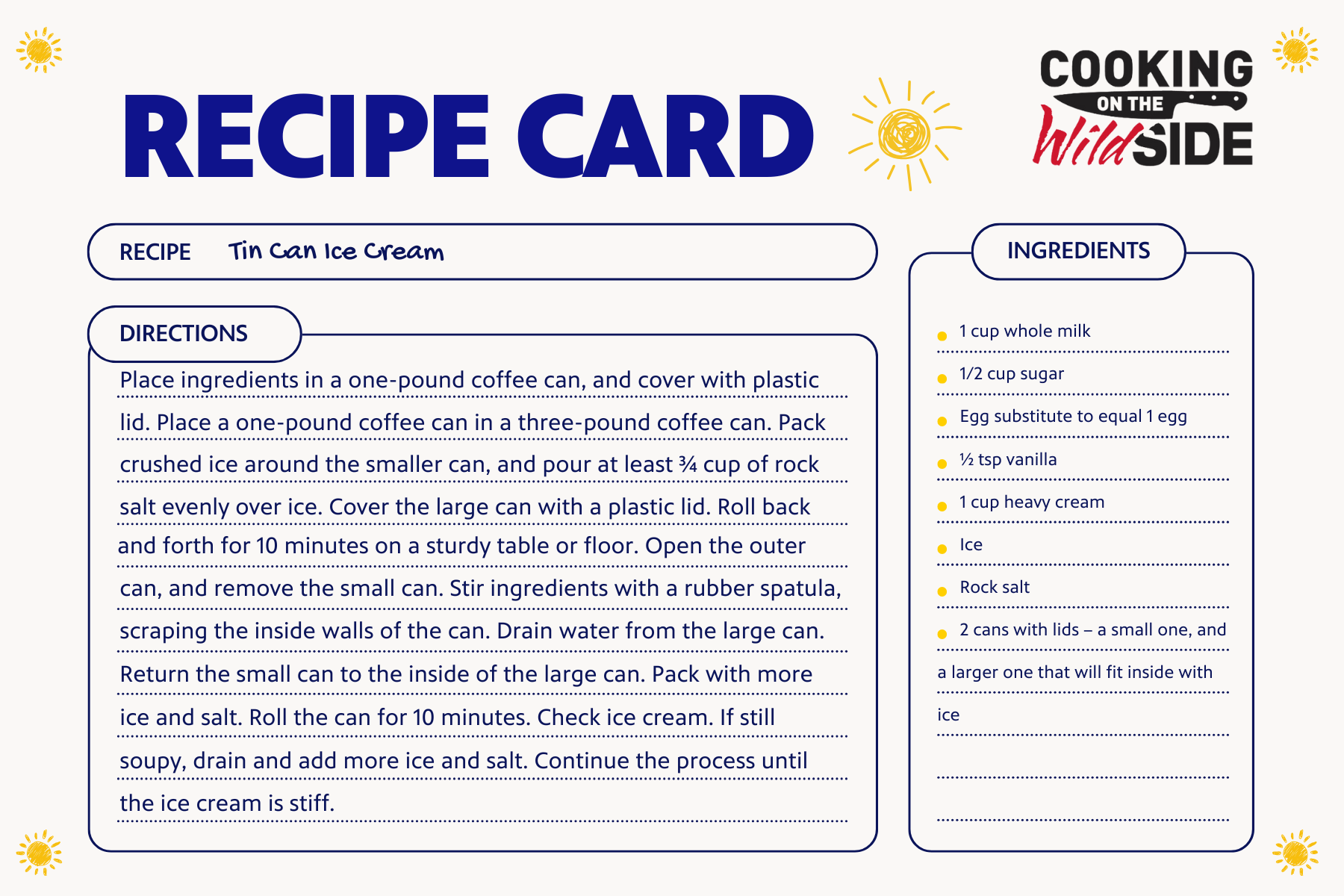 1. Place ingredients in a one-pound coffee can, and cover with a plastic lid. 2. Place a one-pound coffee can in a three-pound coffee can. 3. Pack crushed ice around the smaller can, and pour at least ¾ cup of rock salt evenly over ice. 4. Cover the large can with a plastic lid. 5. Roll back and forth for 10 minutes on a sturdy table or floor. 6. Open the outer can, and remove the small can. 7. Stir ingredients with a rubber spatula, scraping the inside walls of the can. 8. Drain water from the large can. 9. Return the small can to the inside of the large can. 10. Pack with more ice and salt. 11. Roll the can for 10 minutes. Check ice cream. 11. If still soupy, drain, and add more ice and salt. Continue the process until the ice cream is stiff.