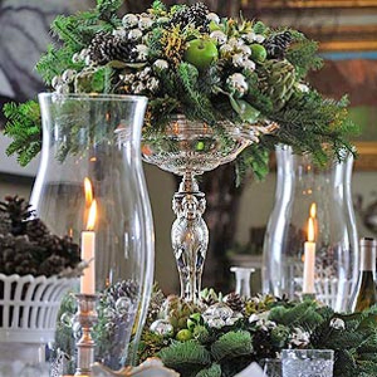 Wreaths can be used as centerpieces to add a pop of color to the table. Set a wreath in the center and embellish it with fruit, glass balls, pinecones – anything you have on hand. You can place candles, a bowl of more greenery or a vase in the center of the wreath.